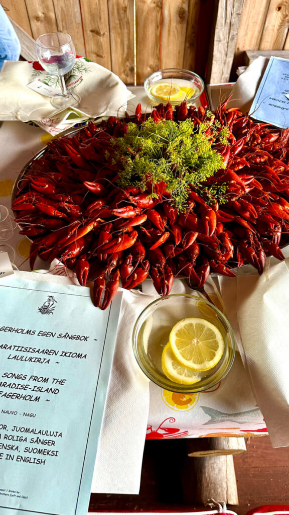 Classic flavours such as gravadlax, new potatoes, crayfish, pickled herring, garden vegetables, and homemade archipelago bread form the backbone of the menu, complemented by drinks from the surrounding region, from crisp wines to spirits distilled just across the water, including Nagu Distillery gins and traditional snaps.