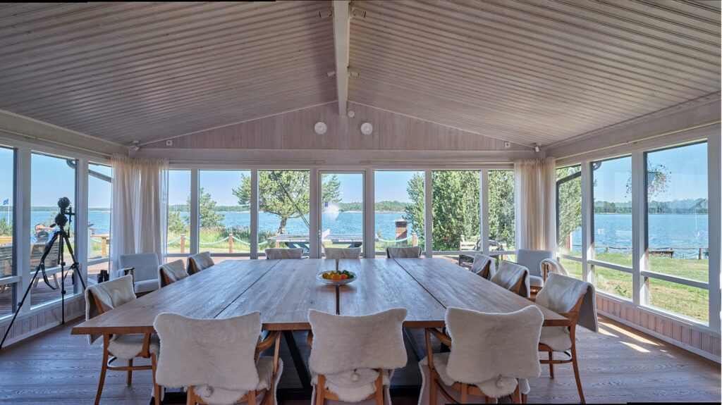 Meals can be enjoyed in the main building’s atrium, close to the fireplace and overlooking the Baltic Sea, or arranged in one of the island’s rustic event houses for a change of atmosphere.